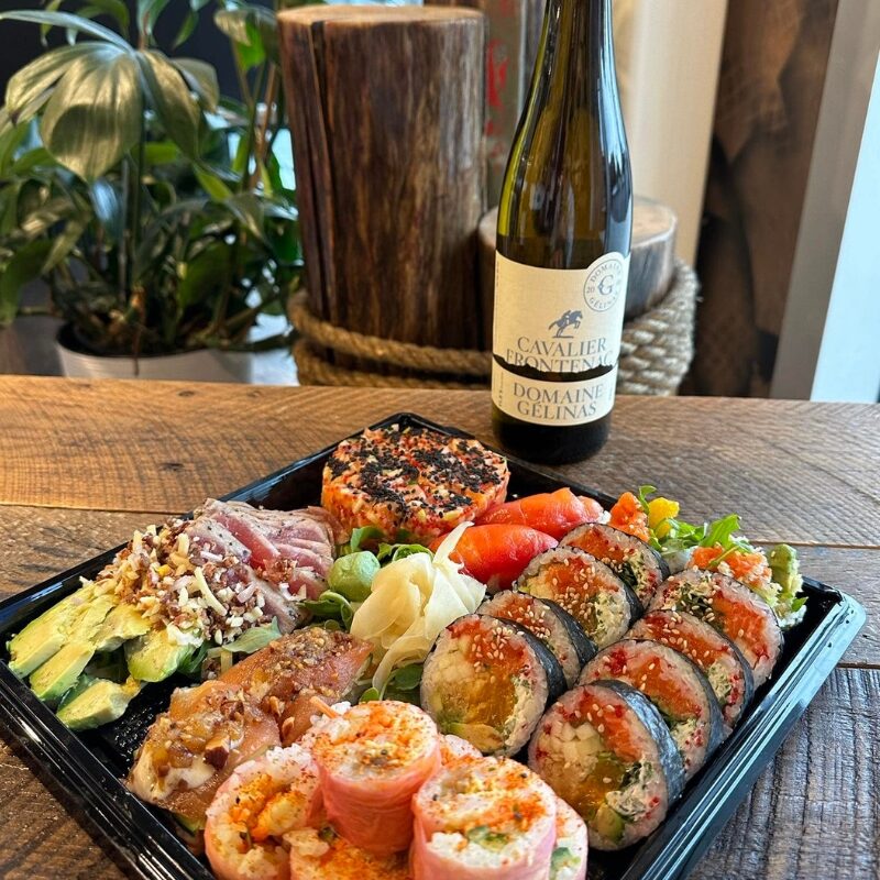 plateau de sushi avec bouteille de vin